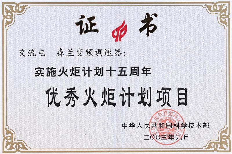 国家优秀火炬计划项目证书