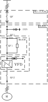 此方案为一拖一的典型方案,QS1、QS2为隔离开关。隔离柜作用:方便检修时有明显的断点,确保人身和设备的安全。
