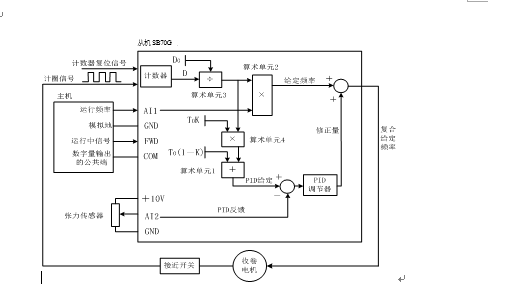 由代表生产纸线速度的主机(四缸或压光机变频器)运行频率和卷绕纸张的实时卷径计算出相应的从机(卷取机)主给定频率,以此作为前馈;同时用PID调节器控制纸张的张力PID输出,对给定频率进行不断修正,将修正后的频率作为卷取电机的给定频率。这种前馈和反馈共用的复合控制方法控制精度很高,很多张力控制专用的变频器都使用了这种方法。而SB70G可以通过可编程模块来编程实现这种控制,使用方便,方法灵活。系统控制框图如下: