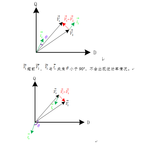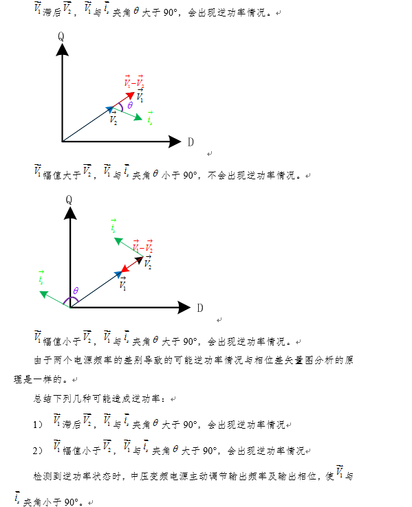 两个电压源同时给负载供电时,由于并网运行时的相位、频率和幅值之差导致的逆功率。下面从矢量图分析几种逆功率产生的机理,V1为岸用电源,V2为发电机电源。